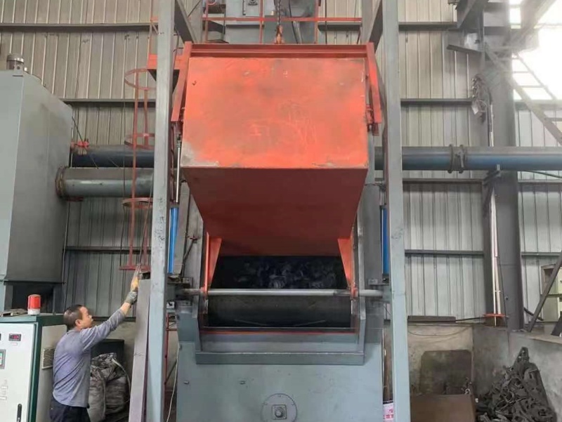 工作原理:在清理室中加入不超過規定數量的工件,機器啟動后,工件被滾筒帶動,開始翻轉,同時拋丸器高速拋出的彈丸形成流丸束,均勻地打擊在工件表面上,從而達到清理、強化的目的。拋出的彈丸及砂粒經橡膠履帶上的小孔,流入底部的鋼板網過篩,由螺旋輸送器送入提升機內,由提升機提升到分離器中進行分離。粉塵由風機吸送到除塵器中過濾,清潔空氣排入大氣中,布袋上的灰塵經機械振打落入除塵器底部的集塵箱中,用戶可定期清除,廢砂由廢料管流出,用戶可回用。丸砂混合物由回用管收回進入室體,待分離器分離后再回用,干凈的彈丸由電磁供丸閘門進入拋丸器拋打工件。